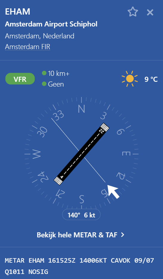 For flights in CTR zones (control zones around airports), we also utilize the METAR and TAF from the KNMI. METAR provides current information, such as visibility distances and precipitation, while TAF offers forecasts for specific time periods. This helps us remain safe and well-prepared.